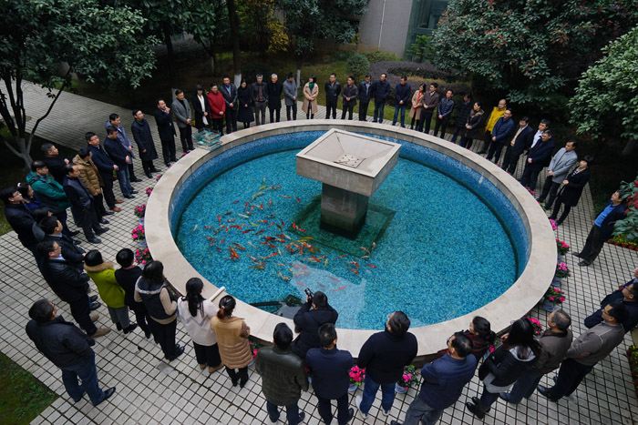 圖為公司黨委書記、總裁李葉青投放錦鯉時(shí),現(xiàn)場(chǎng)掌聲雷動(dòng)
